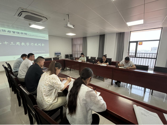 2024年5月22日,经济管理学院在新行政楼725召开第十二周教学行政例会,会议由院长吴玲主持,副院长秦品德、院长助理张珊、实训中心主任及各教研室主任参加会议。