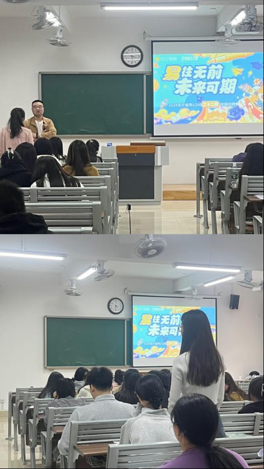 为提高毕业生就业主动性,拓宽就业渠道,推进就业工作高质量发展。近日,经济管理与建筑工程学院于一教404、405教室举办“华孚时尚、学思堂教育、苏宁易购有限公司”线下专场宣讲,书记助理叶赵强、就业专员蔡晨光、毕业班辅导员张雨停、邓金鑫、朱艳丽分别在两个教室负责本次校企合作日宣讲会,2022级市场营销专升本、人力资源管理专升本、物流管理专升本等专业240余名毕业生此次招聘会。活动由蔡晨光、张雨停支持。