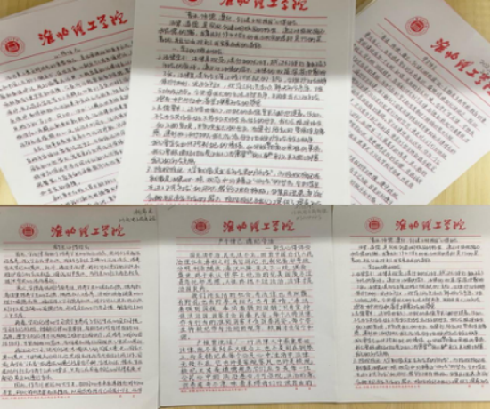 为帮助学生学习的法律知识、品德要求、校纪校规等,11月上旬,经管学院要求全体学生认真手写一份不少于1000字的心得体会,并指出了自身存在的差距和今后的努力方向,并就主题做出承诺书。同学们用肃穆的文字,庄重的承诺,表示定会将法治精神落实到日常事务之中,活动成效显著。