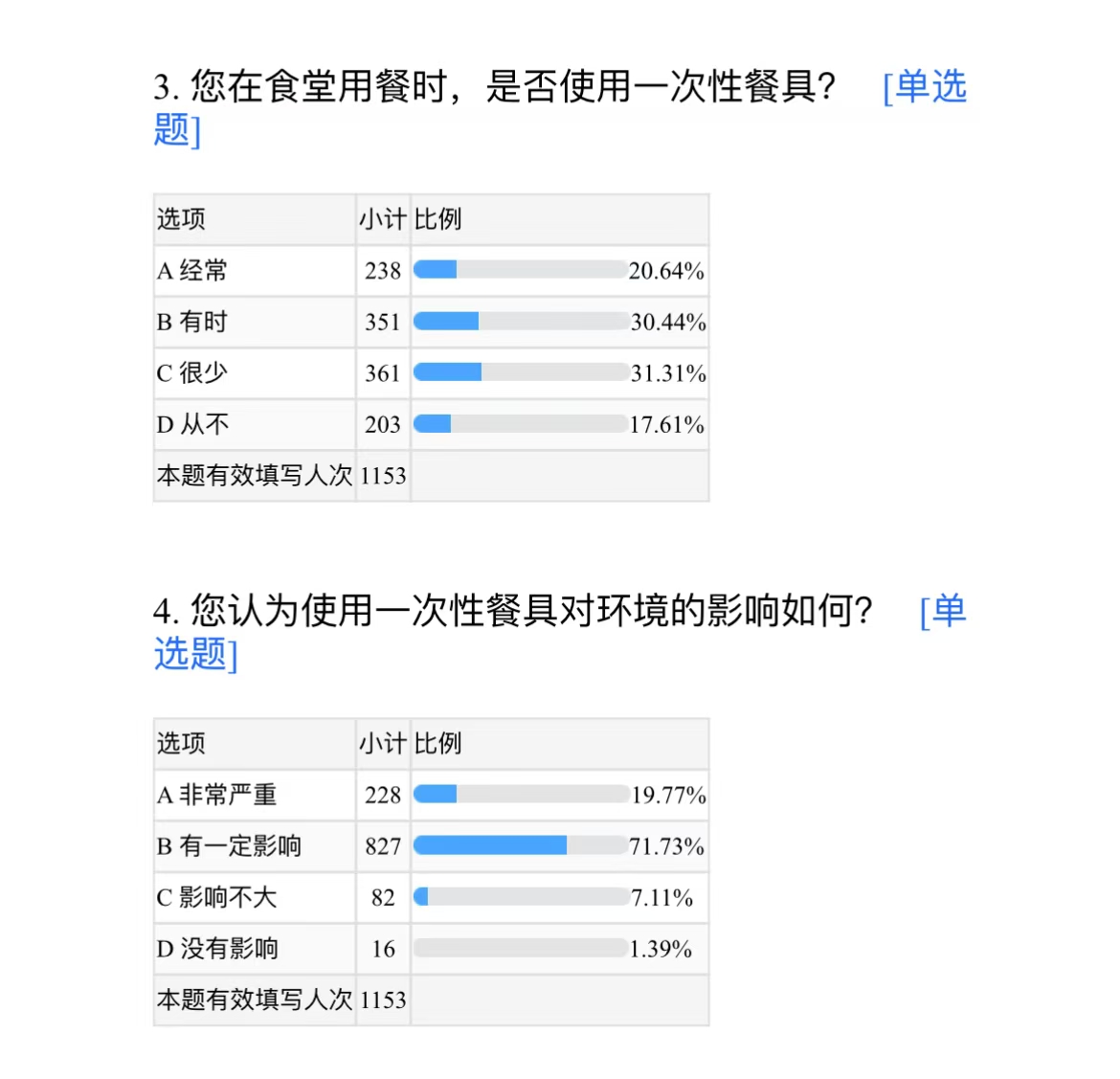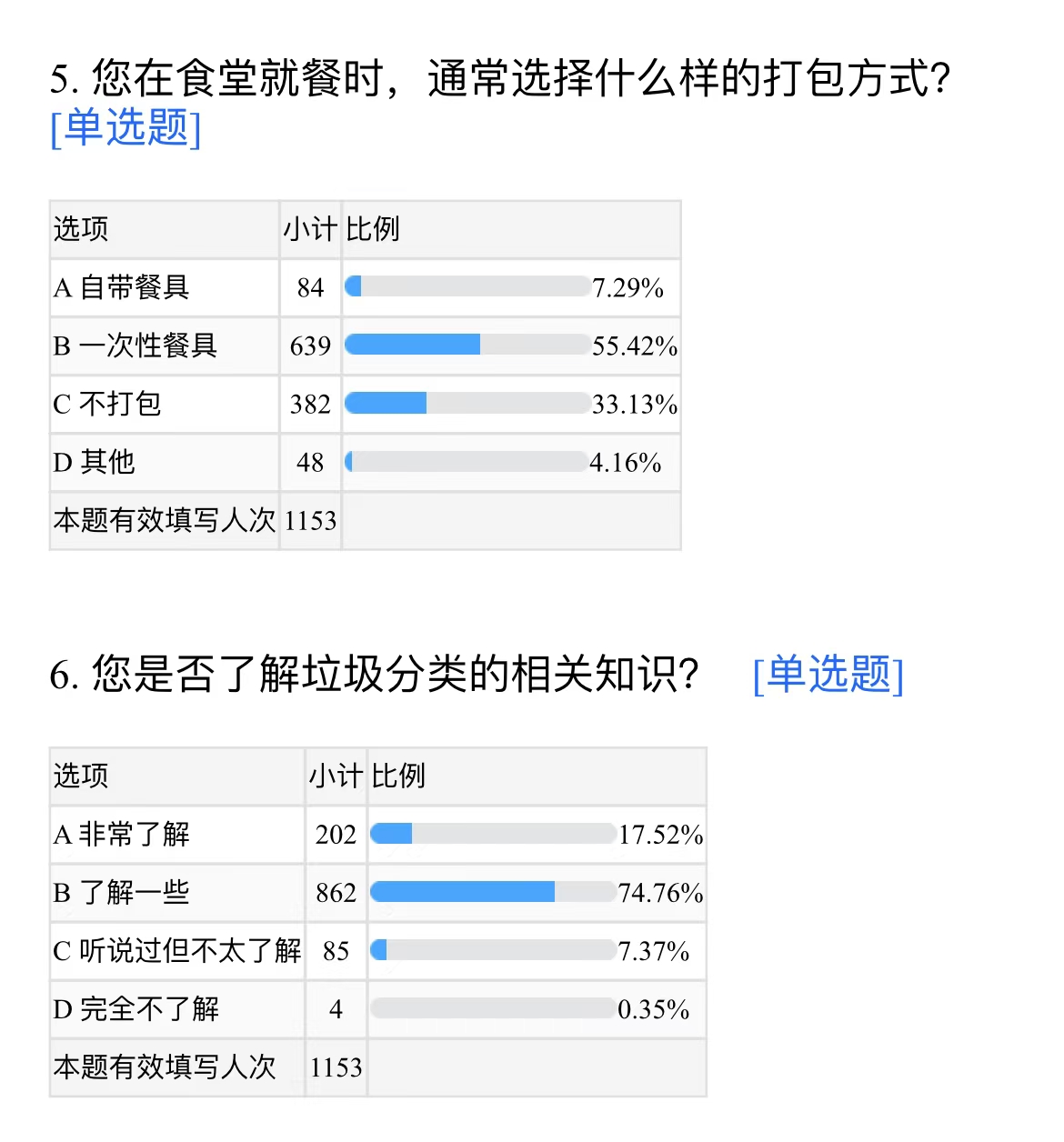 为了更全面地了解问题,辅导员们还组织志愿者发放了调查问卷,深入了解学生的环保意识,共收集到1153份有效问卷。问卷结果显示,尽管大部分学生对环保有一定的认识,但在日常实践中,如减少一次性餐具使用、正确分类垃圾等方面,仍有待提升。