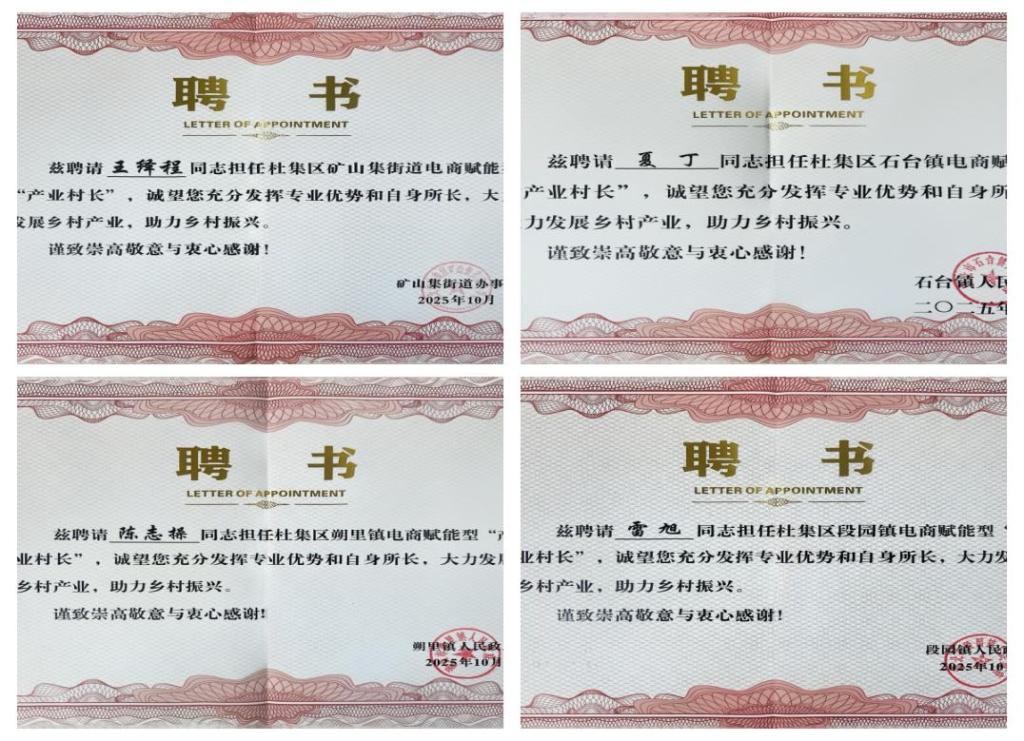 “一村一主播”校地共育项目启动实施以来,精准破解乡村特色农产品销售难、农民数字技能薄弱等痛点。采用“教师带学生、团队驻村点”的模式,将高校智力资源、人才优势与乡村产业需求深度对接,短短数月便实现从“技能培训”到“直播变现”的全链条突破,培育乡村数字化运营人才队伍,成为校地协同助农的鲜活样本。由于项目运作的出色,4个试点村团队负责人均被正式聘为所在村“乡村产业指导员”(产业村长)。
