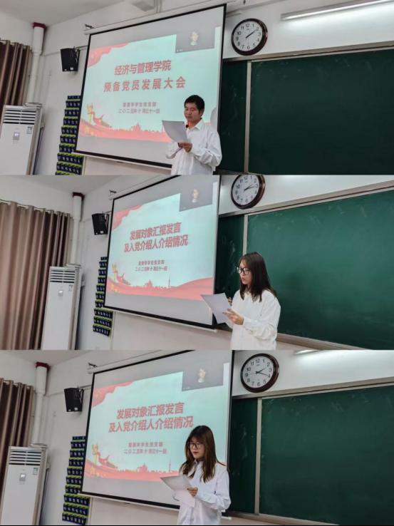 大会第一项,发展对象王星星等三位同志向党组织汇报自身情况。他们详细阐述了对党的认识、入党动机、个人履历家庭及主要社会关系等情况,表达了自己志愿加入中国共产党的坚定信念和强烈愿望,展现了接受党组织考验的真诚态度。