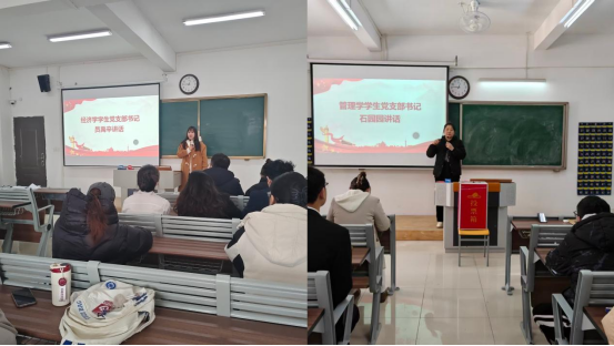 经济学学生党支部书记员禹辛、管理学学生党支部书记石园园在总结中向新党员表示祝贺,并强调全体党员应筑牢信仰根基、强化责任担当、严守党的纪律,在学习和工作中走在前、作表率,以实干实绩为学院与学校发展贡献力量,让青春在为国家与人民奋斗中绽放光彩。