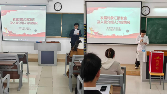 在经济学学生党支部会场,支部书记员禹辛、青年委员王绎程、辅导员郑凡、李茹参会,院党总支组织员王胜男列席指导。赵杭江等7名发展对象依次宣读《入党志愿书》,结合个人思想认识、现实表现及入党动机等方面向党组织作汇报,表达了加入中国共产党的坚定意愿。入党介绍人分别介绍了发展对象的培养考察情况,与会党员进行充分讨论后,通过无记名投票一致同意接收7名同志为预备党员。