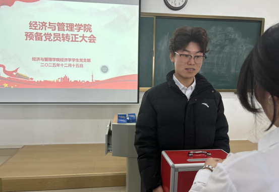 2025年12月15日,taptap点点官方网站经济学学生党支部预备党员转正大会在学院第一教学楼422室顺利召开。本次大会由党支部组织委员张力同志主持,党支部书记禹辛老师、青年委员王绎程老师,以及学院组织员、宣传委员王胜男老师出席。党支部全体党员共52人以线上线下相结合的方式参会,其中具有表决权的正式党员19名,符合相关规定要求。