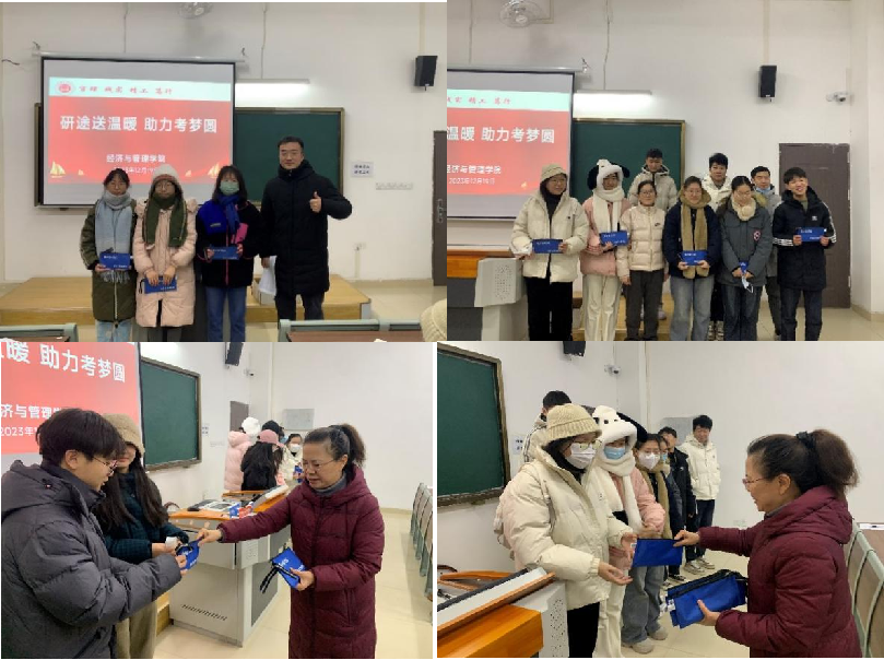 2024年全国硕士研究生考试近在咫尺,为缓解考研学子考前压力,增强迎考信心,2023年12月19日taptap点点官方网站党总支书记、院长吴玲,学院书记助理、团总支书记叶赵强和2024届毕业班辅导员携暖心包至二教121教室开展“研途送温暖,助力考梦圆”爱心送温暖活动。