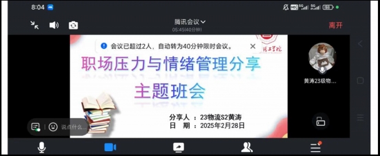 本次线上主题班会分享就业经验的同学们,用自己“过来人” 的亲身经历,深入剖析了职场中常见的压力源和情绪问题。工作强度大带来的身心疲惫、人际关系复杂导致的困扰,都成为了引发焦虑、抑郁等不良情绪的导火索。