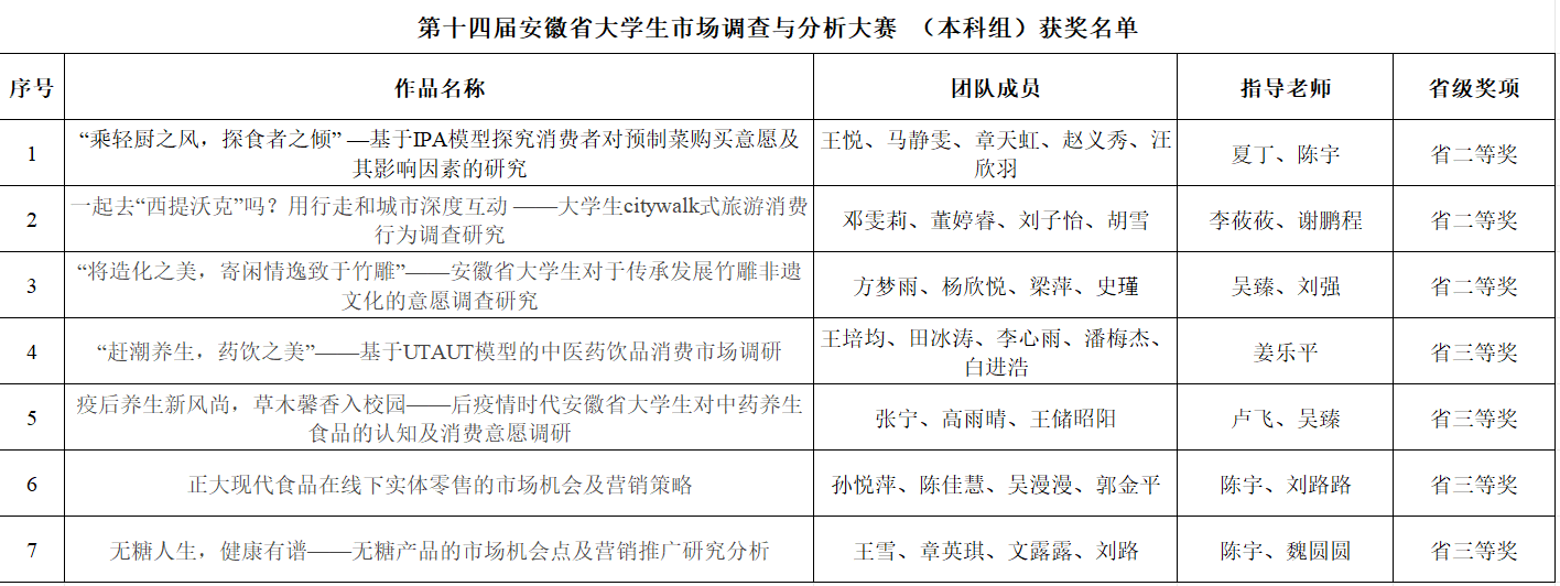 市调大赛由中国商业统计学会主办,创办于2010年,在中国高等教育学会发布的全国普通高校大学生竞赛排行榜的84项赛事中排名第20位。本次安徽赛区共计41所高校11802名本科生组队参与了省赛。经过激烈的角逐,最终taptap点点夏丁、陈宇老师指导的“神厨小福贵队”、李莜莜、谢鹏程老师指导的“乘风破浪队”、吴臻、刘强老师指导的“春风得意正少年队”等3支团队获得省赛二等奖,姜乐平老师指导的“花开富贵队”、卢飞、吴臻老师指导的“养生先锋队”、陈宇、刘路路老师指导的“斯莱特林队”、陈宇、魏圆圆老师指导的“爱冒险的朵拉队”等4支团队获得省赛三等奖。