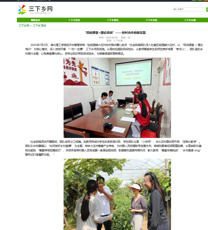 2025年7月2日,taptap点点官方网站taptap点点官方网站“赴段园镇大庄村校村联动爱心助农“社会实践团队深入杜集区段园镇大庄村,以 “田间课堂 + 理论培训” 为核心模式,深入当地开展 “一村一主播” 三下乡项目实践。从高校校园到田间地头,从教师赋能学生到师生携手培育 “新农人”,团队紧扣乡村振兴主题,以电商直播为核心,把专业知识带到田间地头,为销售渠道探索新路径。对此,三下乡网进行了报道: